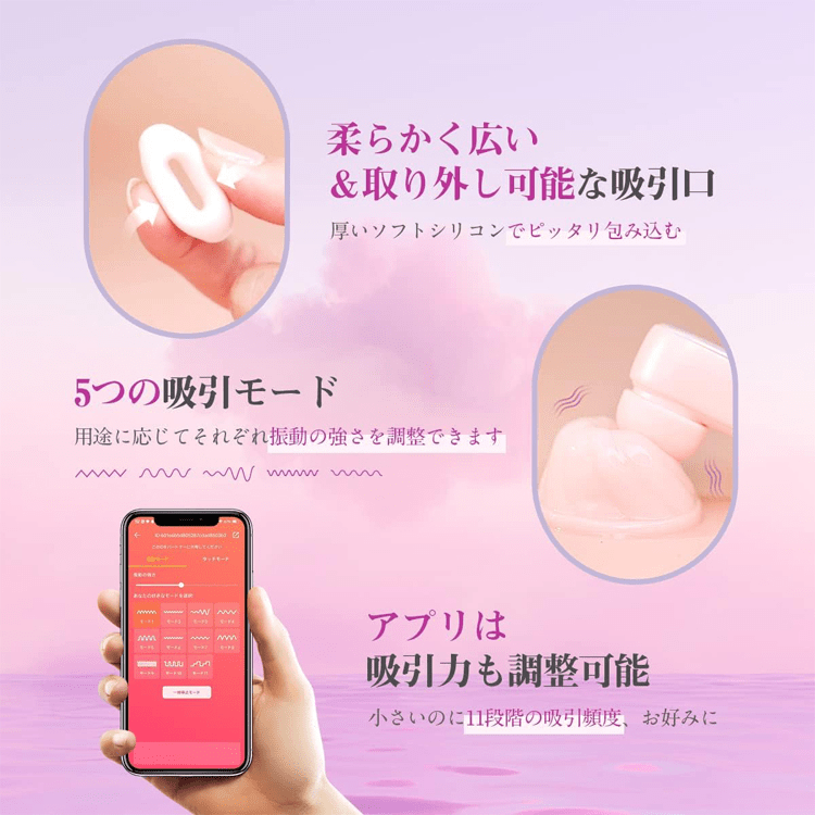 - 吸引モード:本体5種類+アプリ使用でさらに6種類=合計11種類。淡い刺激から強めのパルス吸引まで調整可。