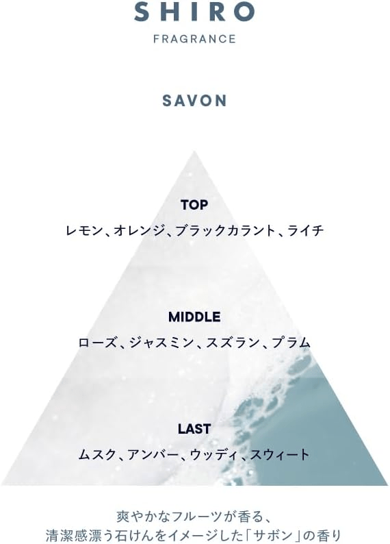 石けんっぽい清潔感に、柑橘とフルーティーな明るさが重なって、男女どちらでも使いやすいのが魅力です。